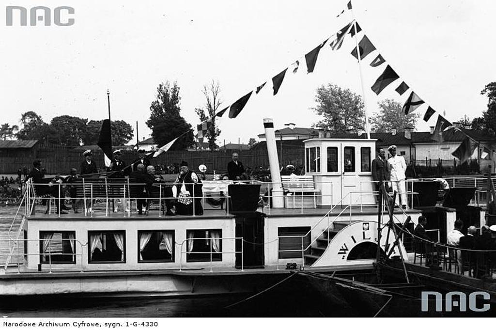 Statek pasażerski "Wilia". Na pokładzie widoczni uczestnicy uroczystości poświęcenia statku.