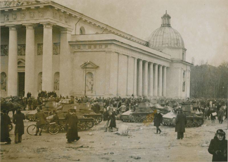 Vilniaus atgavimo iškilmės Katedros aikštėje, matosi Lietuvos kariuomenės šarvuočiai. 1939 m. spalis 29 d.