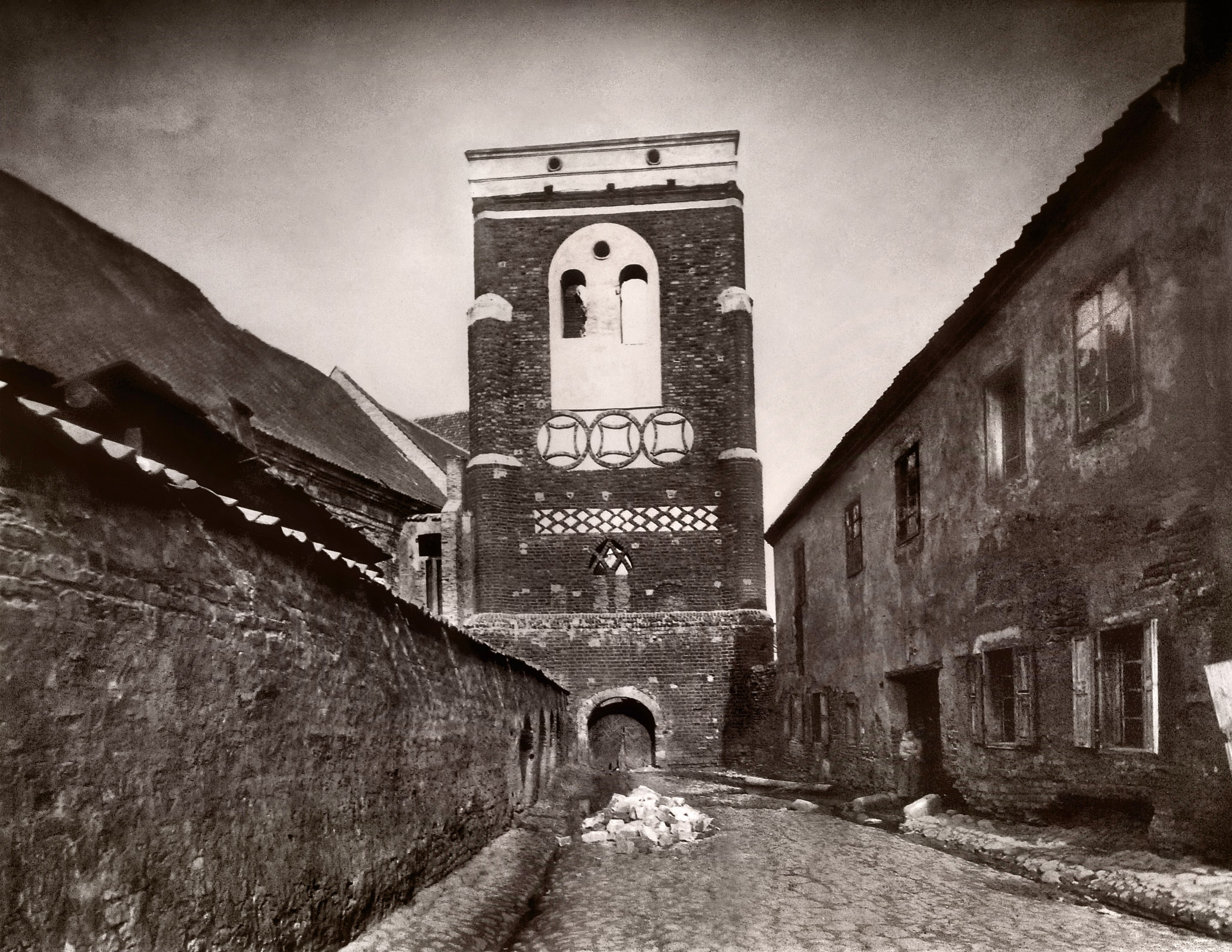 Griaunama Pranciškonų Švč. Mergelės Marijos Ėmimo į dangų bažnyčios gotikinė varpinė Vilniuje. 1873 m. Fotografas Juzefas Čechavičius