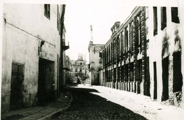 Dešinėje M. Strašūno biblioteka Žydų gatvėje. Už jos buvo Didžioji sinagoga. 1946 m.
