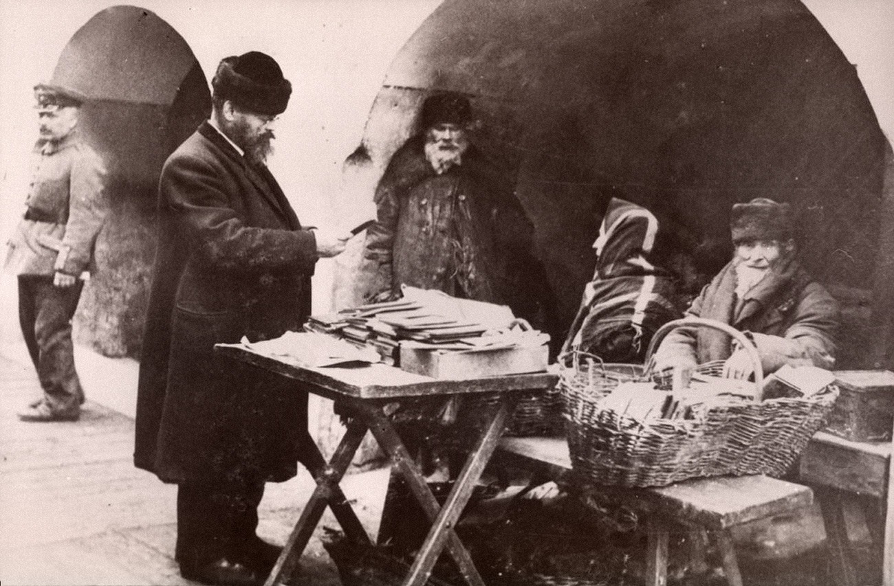 Prekiautojai knygomis Didžiosios sinagogos kieme 1915-1917