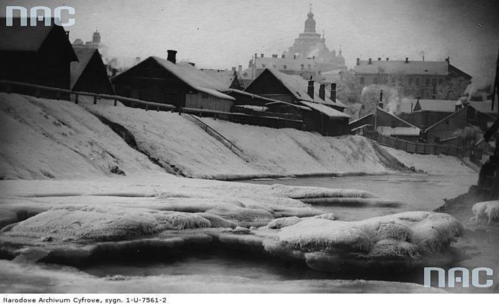 Widok zabudowań nad rzeką Wilenką z widocznym kościołem św. Kazimierza w tle. Widok od strony Zarzecza.