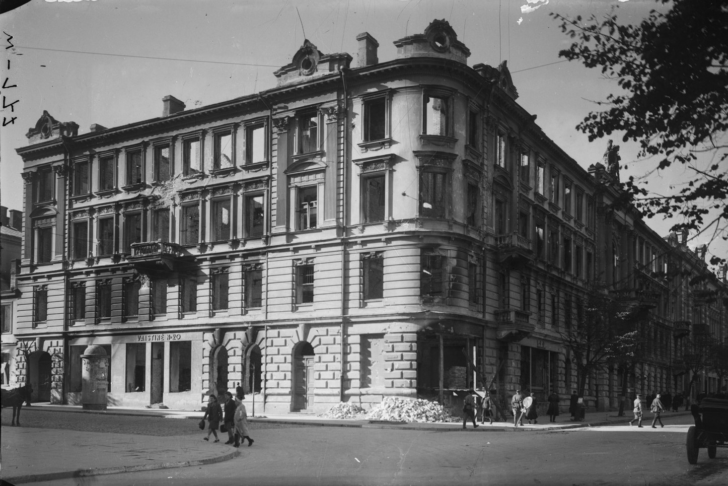 Gedimino prospektas. Pietinė gatvės pusė. Georgijaus arba „Jurgio" viešbutis (buvęs Mickevičiaus g. 18). 1944 m. rugpjūtis. Fot. Janas Bulhakas. Pastatas apdegė 1944 m. liepos 10 d., po karo atstatytas ir pritaikytas viešbučiui „Vilnius". Dabar - universalus prekybos centras.