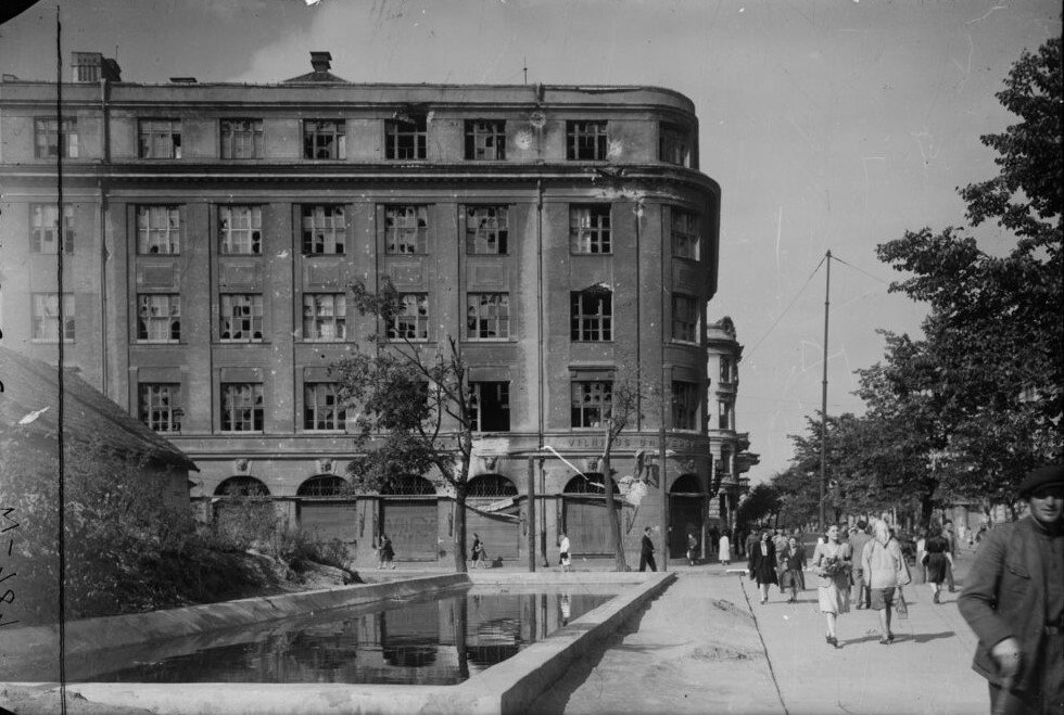 Brolių Jablkovskių prekybos ir pramonės rūmai Gedimino prospekte (tada vadinosi gatve, iki 1939 m. Adomo Mickevičiaus), 1944 m. Fot. Jan Bułhak.