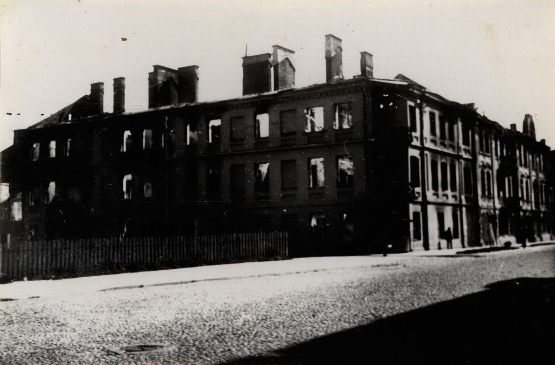 Pamėnkalnio gatvės rytinė pusė. Namas Pamėnkalnio ir K. Griniaus gatvių sankirtoje. 1944 m. rugpjūtis. Fot. Janas Bulhakas. Pastatas sudegė 1944 m. liepos 6-13 d., po karo nugriautas, jo vietoje pastatytas gyvenamasis namas. Name veikė pirmoji Vilniuje Jano Bulhako fotografijos ateljė, įsteigta 1912 m.