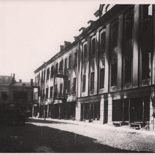 Liejyklos gatvės šiaurinė pusė 1944 m. po karo. Namas Nr. 4/6 1942 m. kovo 23 d. buvo pažeistas sovietų bombų. Sovietmečiu suremontuotas. Nr. 2 sudegė po 1944 m. liepos 11 d. Sovietmečiu nugriautas. Fot. Jan Bulhak
