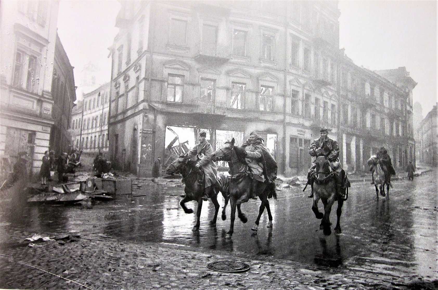 Šlapiu gatvės grindiniu joja Raudonosios armijos kavaleristai. Subačiaus ir Aušros Vartų gatvių sankryžoje suversti išplėšti rakandai.1944 m. liepos 13 d.