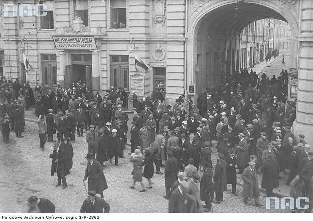 Grupy uczestników wiecu opuszczają budynek Miejskiego Kinematografu Kulturalno-Oświatowego.