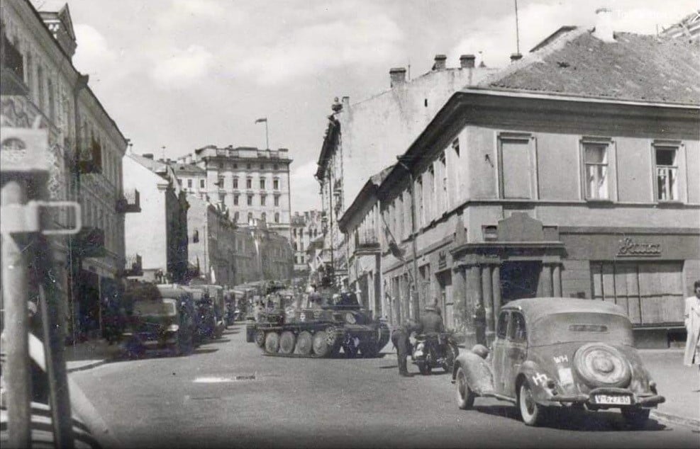 Vokiečių tankai J. Basanavičiaus g. Vilniuje. Tolumoje plevėsuoja Trispalvė. 1941 m. birželio 24 d. Sakalo Gorodeckio asmeninio archyvo nuotrauka