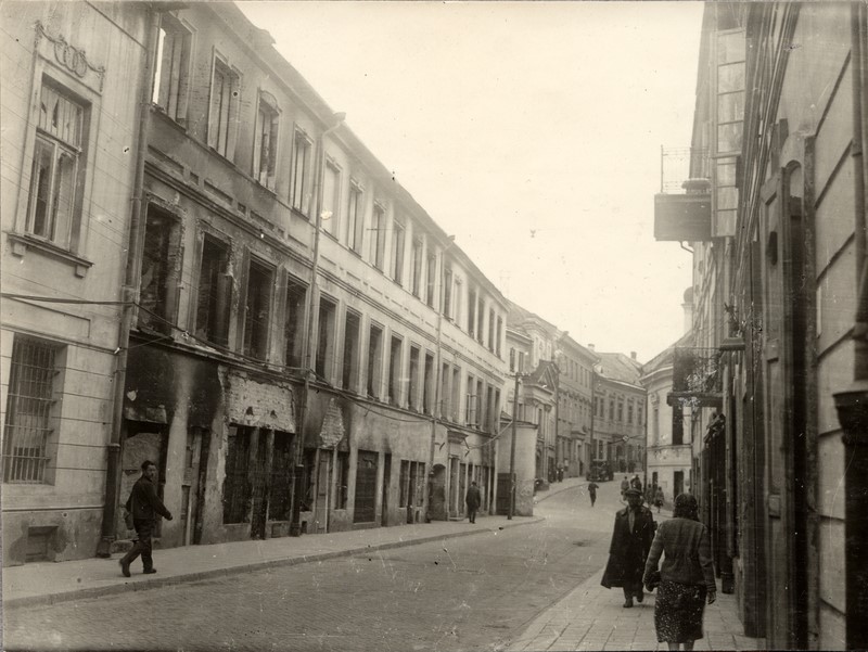 Šv. Jono gatvė (kairėje architekto Lauryno Gucevičiaus namas, sovietų armijos sudegintas 1944 m. liepos 11-12 d.). 1944 m. Fot. Janas Bulhakas.